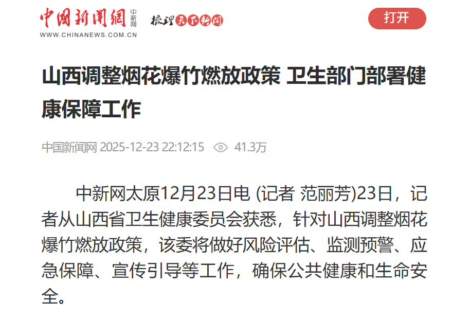 “回山西,放炮去!”这句在社交媒体上引发众多点赞的网友倡议,正在为即将到来的春节做着热闹的铺垫。12月16日,山西省人民政府宣布废止施行五年之久的全省烟花爆竹“禁放令”,管理政策从“全面禁止”转向“科学限放、有序管控”。